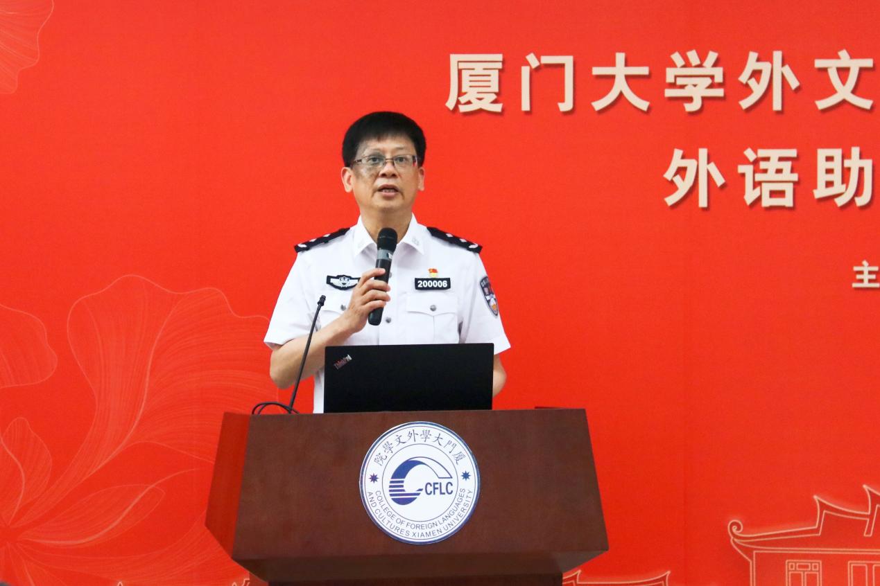 邓海鹰副局长首先发表致辞。他对学校一直以来对厦门公安及出入境管理工作的关心支持表示由衷感谢,他指出,随着厦门市对外开放程度的不断提高,“警译求精”警务翻译实践项目的开展对警务活动具有重要意义。聘任警务外语助理协助工作,是探索警校联动的重要创新举措,将为警力增加“新引擎”,为提升警务实战能力提质强能,同时也有助于实现语言服务与语言教育的双向共赢。他希望未来能够继续加强双方多领域的深度合作,为厦门市“两高两化”城市建设和高质量发展培养更全面的优秀人才,创造更良好的社会环境。