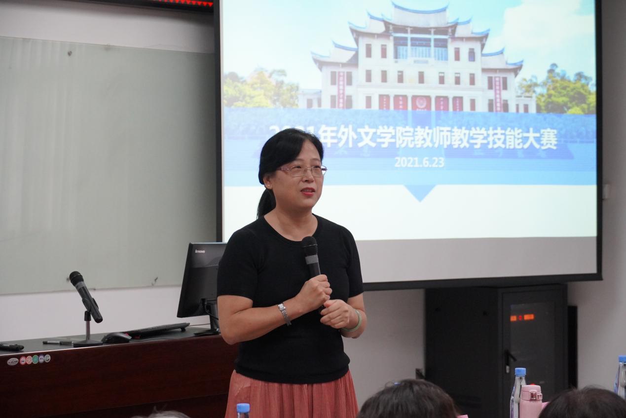 为深入贯彻落实全国教育大会精神,引导青年教师进一步强化立德树人理念,潜心教书育人,提升教师教学创新能力,6月23日下午,外文学院成功举办2021年教师教学技能大赛。本次比赛由各系部推荐,共有英、日、法、德4个语种的6名中青年教师参加比赛。校教师发展中心副主任薛成龙、傅似逸教授、外文学院党委书记陈志伟、副院长李美华教授应邀参加本次比赛。英语语言文学系主任杨士焯教授、外语教学部主任江桂英教授、欧洲语言文学系主任顾鸿飞教授、法语语言文学系副主任翁冰莹教授、日语语言文学系副主任马英萍副教授出席活动并担任评委。大赛由外文学院副院长徐琪教授主持,学院中青年教师观摩了此次比赛。