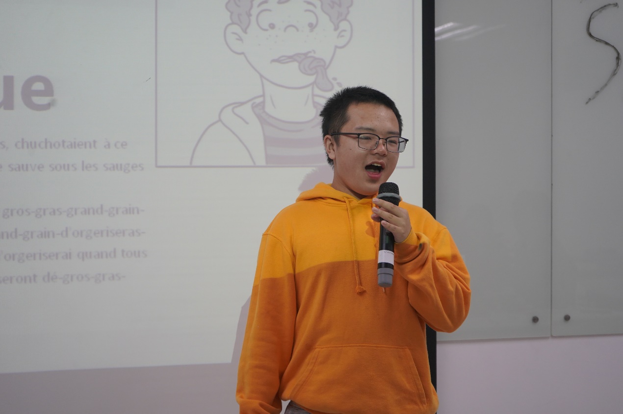 特别是第二轮“你话我猜”小游戏,每组由一位同学随机抽取写有单词的卡片,并以法语进行口头描述,其他同学则提问并猜测卡片上的单词。一时间,场内既有手舞足蹈的比划,又有语无伦次的解释,不时还有一阵阵“猜对了”的欢呼声,着实好不热闹。值得一提的是,策划组精心挑选课本中的单词放到游戏中,使得猜词游戏不仅给同学们提供了锻炼口语表达的绝佳机会,更加深了同学们对课本知识的掌握,让同学们能够在游戏中温故知新。