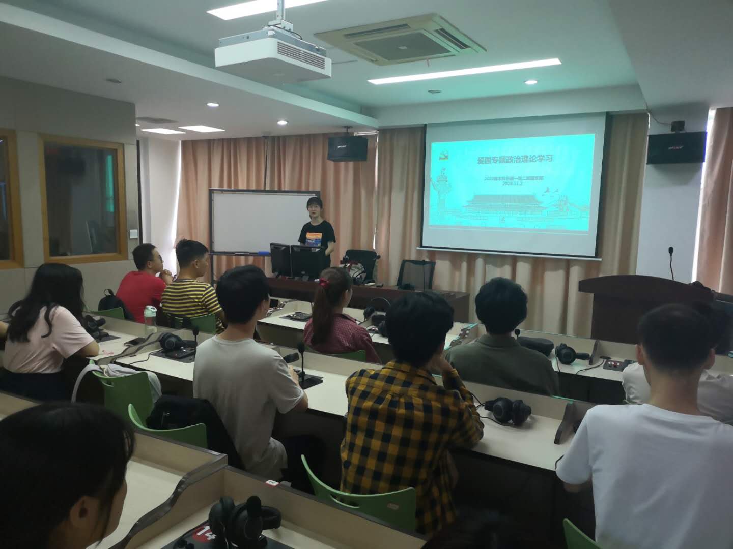 最后,各班团支书针对此次政治理论学习做了总结。爱国,不能停留在口号上,而是要把自己的理想同祖国的前途、把自己的人生同民族的命运紧密联系在一起,扎根人民,奉献国家,共同促进祖国和谐发展。