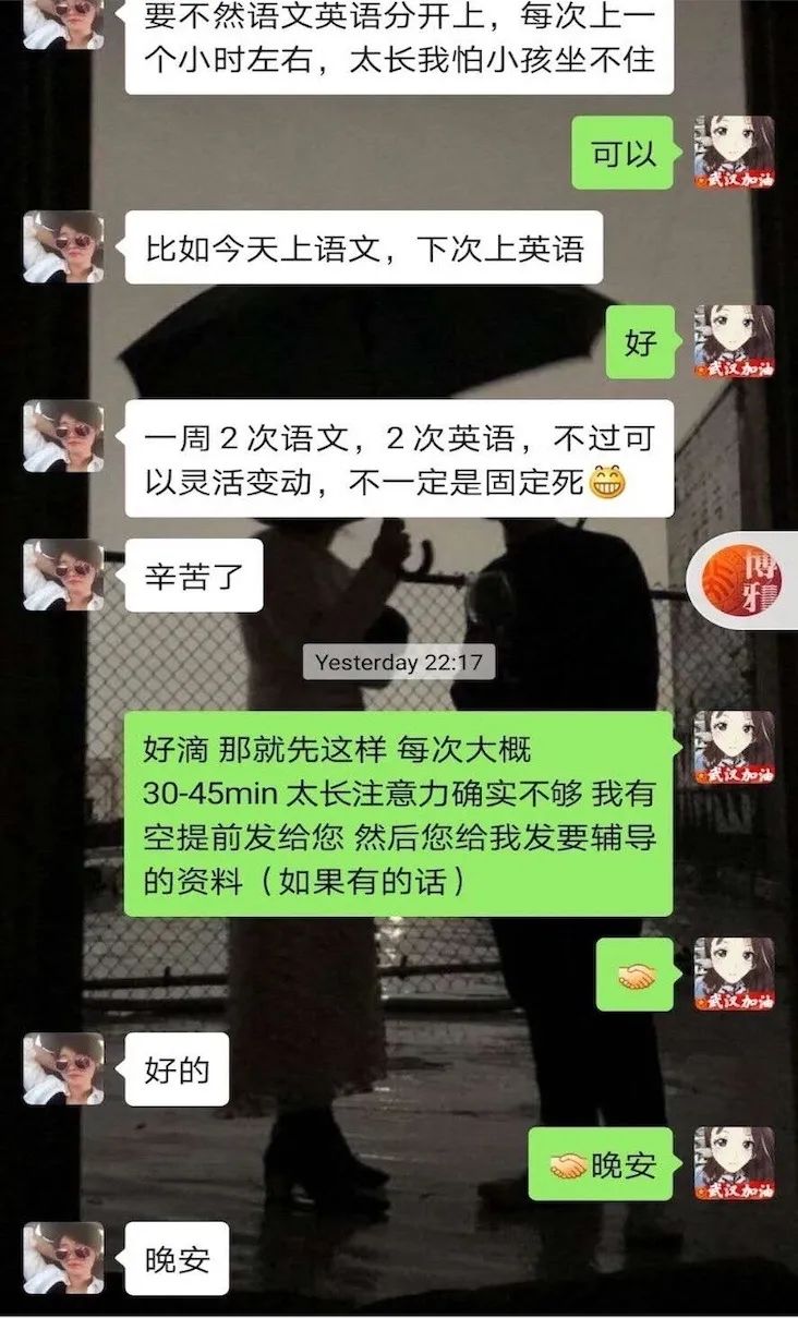 这次活动中,和我对接的学生和家长让我觉得非常感动。虽然平时课业繁忙,学生还是认真完成了布置的作业,听讲也非常认真;而家长在我上完辅导课还发来了长长的感谢,我深觉受之有愧。和前线的医护人员相比,我们做的贡献真的非常有限;可就是这样有限的帮助,却也得到了如此多的感谢和爱。这让我更加有动力,将这份爱继续传递。