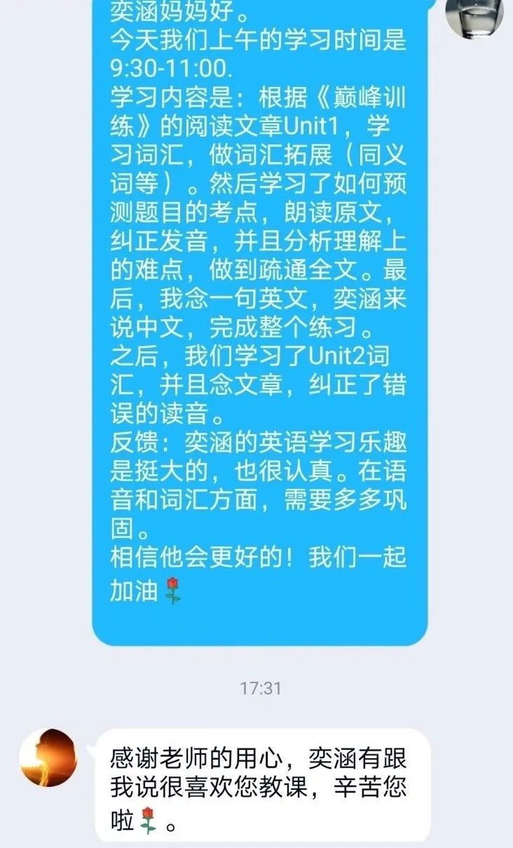 和对接的孩子协商之后,我们确定了每周进行一次2小时的线上辅导,讲解平时布置的练习。刚开始视频上课的时候,学生比较拘谨。但随着课程的进展,我们之间的距离感逐渐消失了,学生对我更加信任,而我们的课堂互动也取得了更好的成效。希望随着课程的进展,学生能够逐渐培养出对于英语学习的兴趣,提高英语成绩,让在前线奋战的家长不再有后顾之忧。