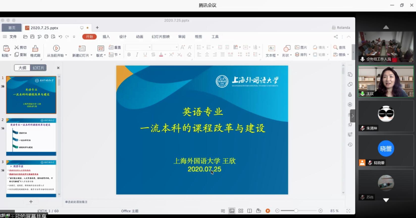2020年7月25日,由外文学院主办、英语系承办的第三届英语专业教学科研工作年会在德贞楼顺利召开。今年的教学科研年会结合英语专业近期“双一流”建设工作的需要,在英语系教师全员参与的基础上,特邀了校内外知名学者、资深教授开展几场专题讲座,并围绕“一流本科专业建设”这一主题集中展开研讨。考虑到疫情期间的特殊规定,本届年会采用线上线下结合的形式举办。