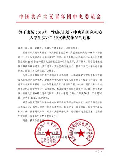 喜讯 | 外文学子在2019年“扬帆计划·中央和国家机关大学生实习”征文活动中荣获一等奖