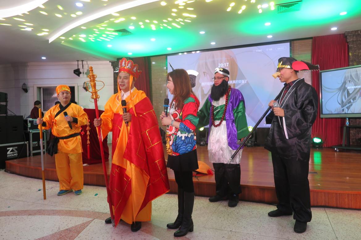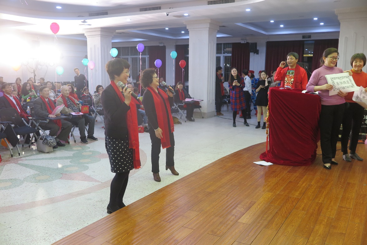 一段热闹的抖肩走秀舞拉开了晚会的帷幕。歌伴舞《在水一方》表现了外文女教师温婉大方的气质;外文学院退休教师带来的独唱(钢琴伴奏)《我爱你,中国》及合唱《华体网祖国》表达了外文人对祖国母亲深厚浓郁的爱意;外教歌曲串烧和欧洲宫廷舞充分体现了外文学院的国际元素,以及外文学院兼容并蓄、海纳百川的胸襟和气魄;歌伴舞《军港之夜》唤起了大家内心澎湃的军旅之情;《小人物喜剧舞》和教职工子女表演的儿童节目《新版拔萝卜》展示了外文人的青春活力和新一代外文接班人的蓬勃朝气;富有创意的《师徒大拜年》节目展现了老师们对外文学院和伟大祖国美好未来的殷切希望和衷心祝福。联欢会的另一抹浓色则是异彩纷呈的互动游戏,比如令人捧腹的《面具拔河》、扣人心弦的《你划我猜》和充满运动元素的《踩气球》等,这些生动活泼的互动游戏为联欢会增添了无限生机和热烈气氛。