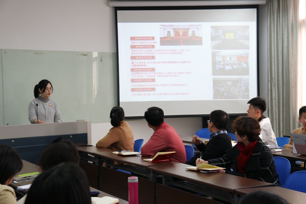 为进一步学习宣传贯彻党的十九届四中全会精神,提升学院党建和思想政治工作效能,12月9日下午,外文学院邀请在教育部挂职担任直属机关团委副书记的学院辅导员周晓牧返校为大家带来一场题为“坚持和完善中国特色社会主义制度,推进国家治理体系和治理能力现代化——党的十九届四中全会精神解读”的党课。学院党委书记陈志伟,党委副书记杨云良、沈丽秀,各党支部书记、委员,全院行政、学工、教辅人员参加了学习。本次党课由学工党支部和行政党支部联合承办。