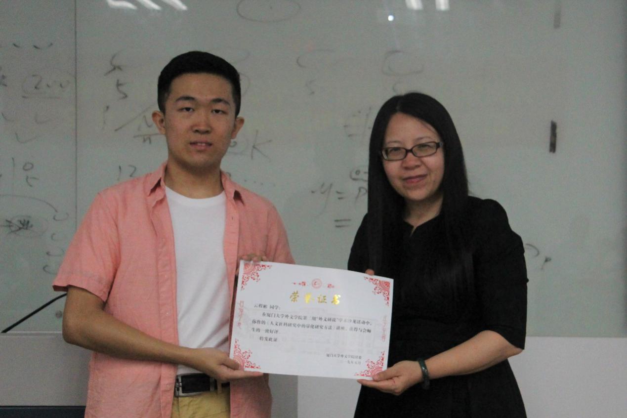 5月24日下午15时,厦门大学外文学院第二期“外文研说”学术沙龙活动在德贞楼415如期举办。华体网2017级英语语言文学专业硕士生云程彬受邀进行题为“人文社科研究中的量化研究方法”的讲座,副院长辛志英教授出席了本次活动。
