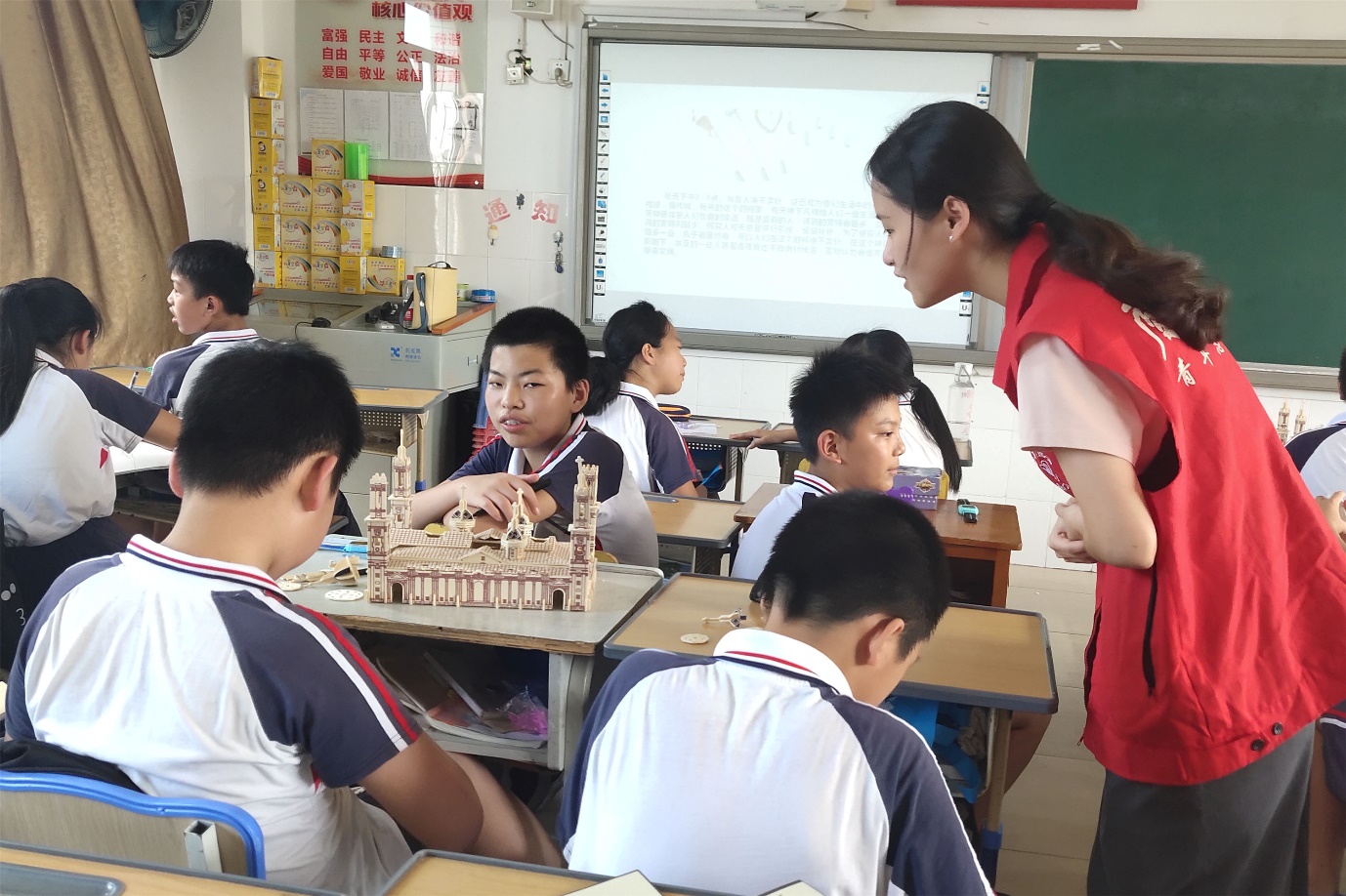 为了进一步培养小朋友们的动手能力与创造力,在带领他们熟悉了各国建筑风格后,实践队员为他们准备了世界各国建筑物立体拼图。在小朋友们的共同努力下,“印度明珠”泰姬陵、“最美哥特式教堂”巴黎圣母院等世界各国标志性建筑呈现在大家眼前。搭建拼图模型的活动使小朋友们在课堂上既享受到了创作的乐趣,也展现了自己非凡的动手能力。