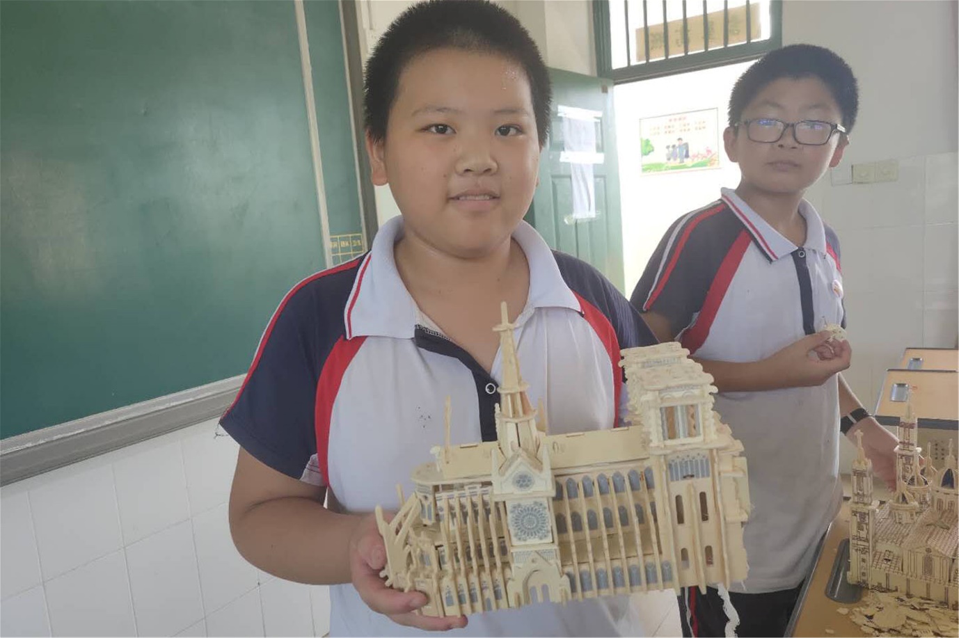 小朋友展示拼装好的巴黎圣母院模型