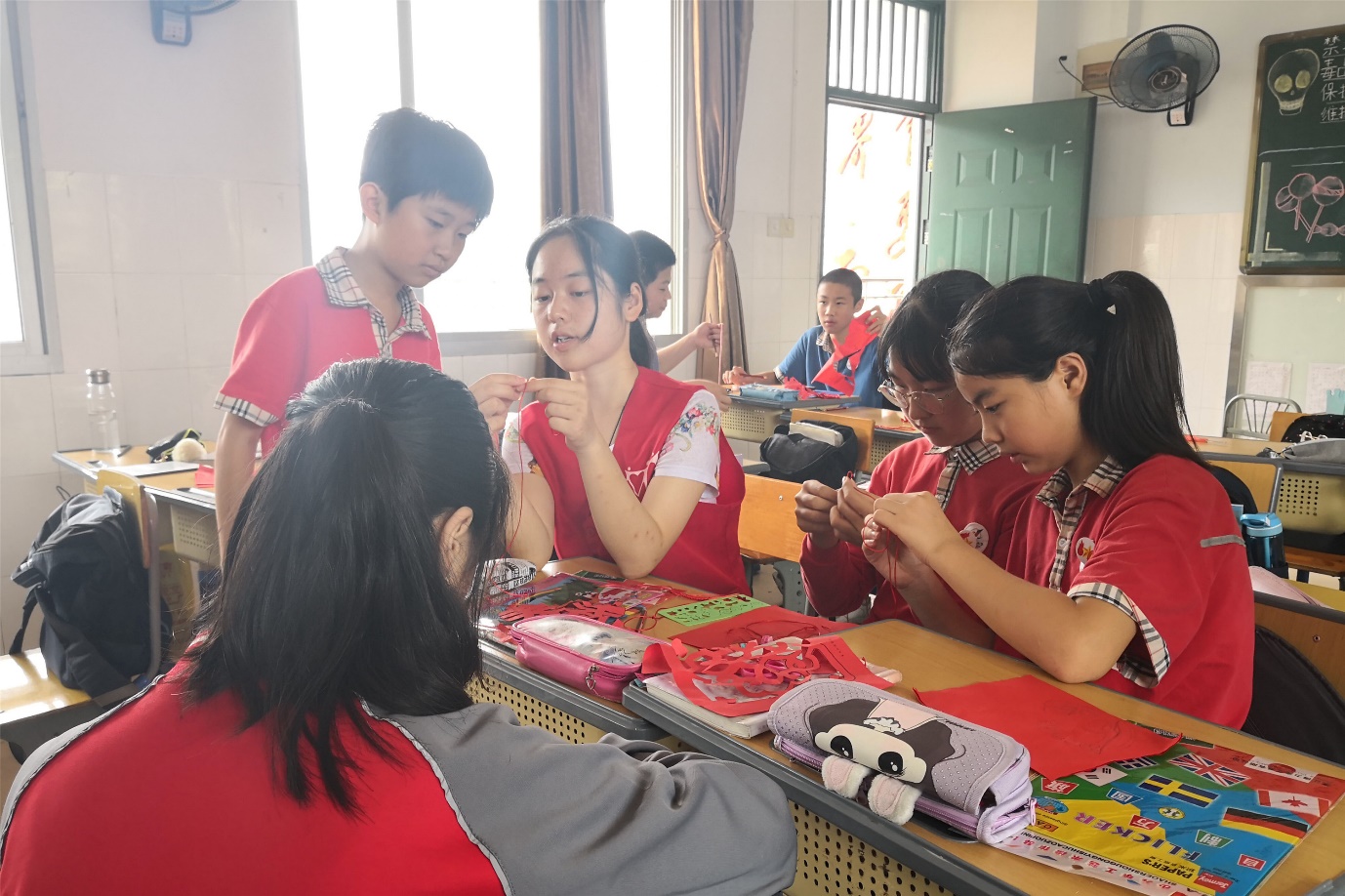 实践队员教小朋友们剪纸