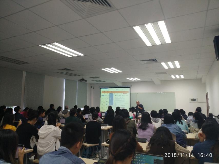 座谈后,陈滨副馆长一行兵分两路。麦林老师在德贞楼323教室为全院师生带来了一场题为“外文资源及其获取”的专场讲座。讲座中,麦林老师深入浅出地向全院师生介绍了厦门大学图书馆为广大师生提供的各种图书资源和信息服务。讲座现场座无虚席,各位老师和同学纷纷表示受益匪浅。