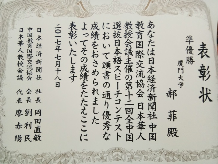 以中国大学生为对象的“第12届中华全国日语演讲比赛总决赛”于7月18日在日经大厦(位于日本东京千代田区)举行。在中国八个赛区的预选赛中脱颖而出的16名代表共赴东京,参加决赛。比赛当日,选手们发表了热情洋溢的演讲,丰富的内容与娴熟的日语获得了在场中日观众的高度评价。我校外文学院2014级日语系本科生郝菲凭借沉着的演讲风格,流畅的日语表达和富有逻辑的演讲思维斩获全国亚军。更值得一提的是,凭借内容深刻,富有趣味的即席演讲,获得由全场观众投票产生的留下最深刻印象的即席演讲奖——“会场特别奖”。
