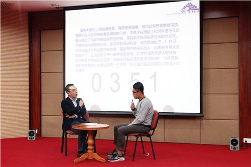 下午2时30分,第三部分比赛“谈心谈话”环节准时开始。该环节要求参赛选手现场抽题,根据题目要求,在规定时间内以情景再现的方式与扮演学生的志愿者进行模拟谈心。本环节设置的问题既十分贴近学生的学习生活,又极具复杂性和特殊性;面对随机抽到的各类难题,辅导员老师们都竭尽所能地以“导航仪”的身份去帮助学生面对各种迷茫和困惑。面对学生提出的棘手问题,张老师从容镇定,在迅速理解问题的症结所在之后便耐心地开导学生,用科学的方法将学生的思维引导到正确的轨道上来,并针对学生的问题提出了切实可行的解决方案,其快速的应变能力、极具说服力和开导性的话语和从容不迫的态度收获了满场的喝彩和评委老师们的认可。