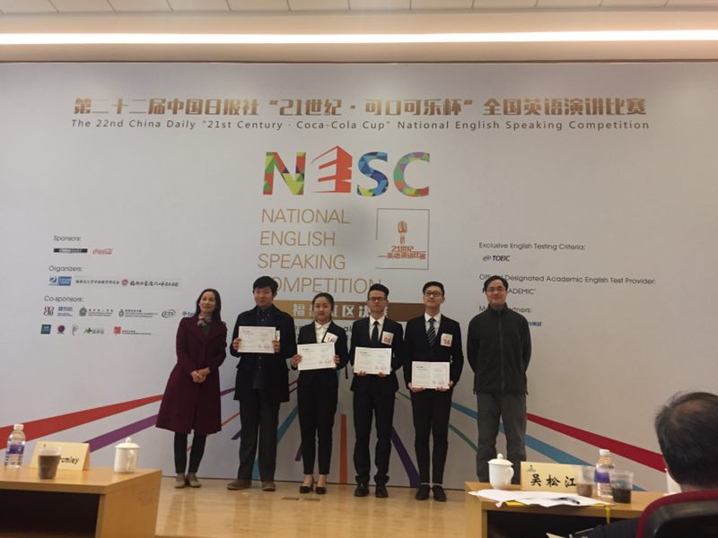 12月24日,第二十二届中国日报社“21世纪·可口可乐杯”全国英语演讲比赛福建省决赛于福州大学厦门工艺美术学院举行。华体网2015级英语专业本科生杨择荟、刘翔两名同学积极备赛,英语系纪玉华教授担任指导老师,两名选手在比赛中表现优异,分获福建赛区决赛冠军奖(第一名)和一等奖(第四名)。