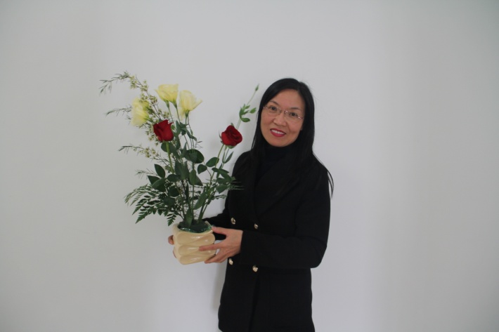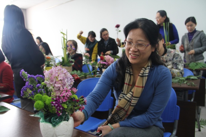 活动伊始,学院妇委会主任徐琪老师代表学院再次祝全体姐妹节日快乐,希望大家放松心情,共同体验插花艺术的快乐。为此,学院特邀国家级花艺师肖光荣进行现场插花教学,从鲜花名称、选花搭配、造型设计等讲解开始,随后现场制作了富有意境的中式风格插花和充满温馨柔美的家居插花作品。顿时现场互动气氛热烈,大家兴趣盎然,跃跃欲试。娇艳欲滴的红玫瑰、粉红可人的绣球花、艳丽夺目的太阳花、紫罗兰、勿忘我,还有非洲腊梅、尤加利、剑叶等等,各种花草在大家的巧手雕琢下各展风姿,或清新淡雅,或高端大气,或色彩绚烂,或新颖创意,一件件精美漂亮的花艺作品为外院增添了一道亮丽的风景线。看着自己亲手创作的插花作品,女职工们充满了成就感与喜悦感,大家纷纷与自己的插花作品合影留念,绽放出花一般的笑容。