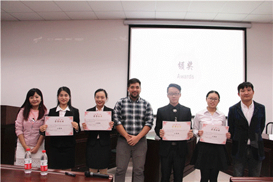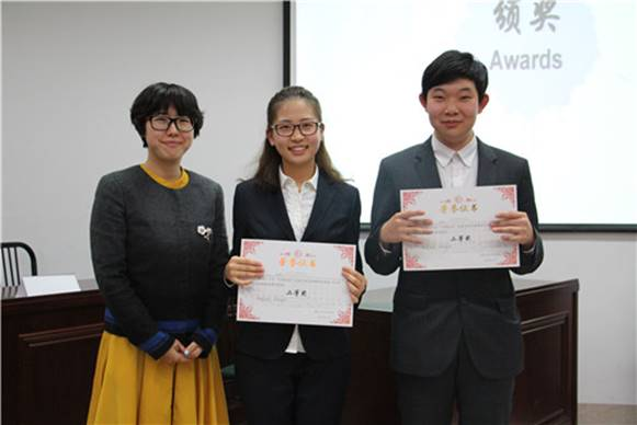 最终,由外文学院2016级硕士生章晨凯和2015级本科生薛静怡组成的“Say Here”队以出彩的表现、默契的配合夺得冠军,刘翔和张艺馨组成的“Peripatetic”队荣获二等奖,三等奖则由陈倩和王慧敏组成的“英语辩论”队及由宋迦南和裴浩然组成的“Knight49”队共同揽获。在个人奖项方面,章晨凯同学以其温和绅士的语言和条理清晰、逻辑缜密的辩述获得“最佳辩手奖”,薛静怡同学凭借其标准、清晰的发音获得“最佳语音奖”,张艺馨同学以其铿锵有力的发言获得“最佳台风奖”,刘翔同学通过富有感染力的手势、神态获得“最具表现力奖”。现场嘉宾和评委老师们共同为获奖队伍和选手颁奖。