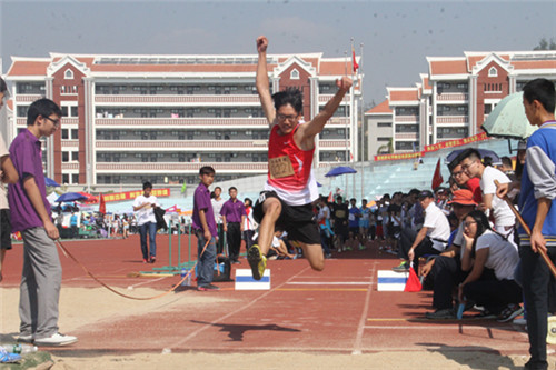 11月5日上午,翔安一期田径场骄阳似火,男子三级跳远的比赛正在火热地进行着。2016级俄语专业本科新生周寰不惧烈日,三次起跳均发挥出色,最终夺得了该项目的第七名。