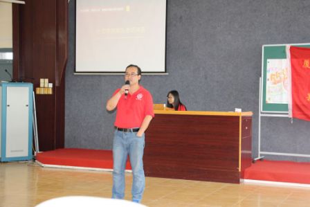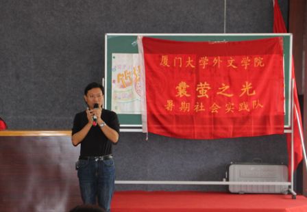 见面会上,竹坝学校吴志荣副校长代表竹坝学校致辞。吴老师提到,“一件事情坚持了,就是神话,放弃了,就是笑话。厦大外文学院和竹坝学校已携手走过了十年,已然在走向神话”。带队老师乐无恙代表外文学院和实践队发言,谈及共同走过的十年春秋里的点点滴滴,乐老师表示“感动、感激、感谢、感恩”。同时他介绍了此次回访队伍成员的组成情况及实践队获得校级表彰,并预祝此次回访成功,祝愿每个来到竹坝的人都觅得幸福,希望双方友谊长存。