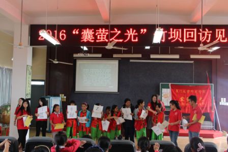 11月12日七点半,厦门大学外文学院研究生“囊萤之光”暑期社会实践队前往厦门市同安区,对竹坝学校进行回访。本次回访由院团委书记、研究生辅导员、实践队带队老师乐无恙及研究生兼职辅导员黄锦鸿老师带领,实践队员代表、外文研会主席书记团成员及2016级研究生新生代表参加了回访。