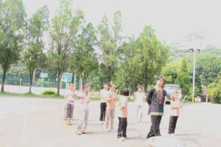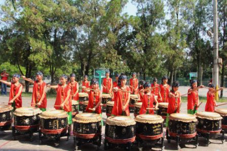 作为一种独特的表演形式,节令鼓追求的并不是磅礴的气势,而是将节奏、武术和书法融为一体。由于节令鼓的发展历史不长,没有形成固定的表演模式,所以鼓队有很大的创意发挥空间。为了让表演更能体现孩子们的天真童趣,同时向他们灌输传统文化的精髓,竹坝的二十四节令鼓队在编排上加入了印尼《沙曼舞》和三字经的元素。刘老师曾是华侨大学节令鼓的队员,目前是竹坝鼓队的外聘教练。他带着孩子们练习如何入场:右手执鼓棒如执书卷,一边念着三字经一边缓缓入场。此时的鼓队在我们眼中更像是一堂儒家思想的启蒙课。