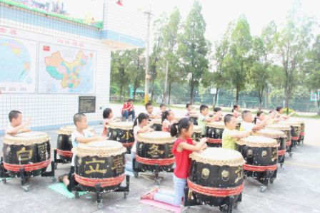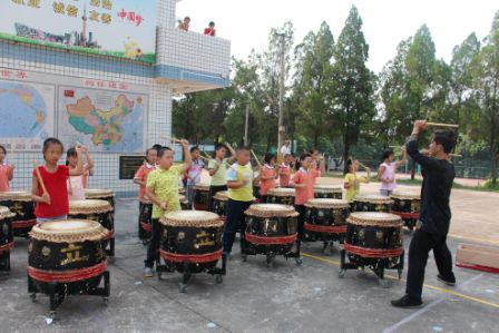 按年龄及技艺熟练程度,鼓队目前分两个梯队,共60余人。在提到鼓队的未来发展时,吴老师的语速明显加快。他希望鼓队可以像学校的排球队一样不断发展壮大,形成良性循环,成为同安区、厦门乃至福建地区最有影响力的一支鼓队,甚至可以走出福建,到台湾去表演。然而,对一个普通农村学校来说,任何一支队伍要发展都会面临很大困难。首先是师资上的困难,由于学校里的老师不是科班出身,专业的老师需要外聘,这是一笔非常可观的开支;其次,学校规模小,有天资的队员相对较少,家长的培养意识也有待提高;另外,鼓队的日常运营和孩子们平时参加的各项活动、表演和比赛经费花费较高。就笔者所见,由于缺乏专业的室内训练场,鼓队的训练一般在室外进行,避免了共振给孩子听力造成的损伤。但七月下旬的厦门,烈日炎炎,孩子们把鼓搬到一栋教学楼投下的阴影里练习击鼓,太阳越升越高,他们只能不断把鼓移向墙根,追寻仅存的一点阴凉。吴老师说,学校每年会从自己的办公经费里节省下一部分资金用于支持鼓队的发展,但相对于鼓队发展所需要的资金投入来说,学校原本就紧张的经费乃至政府每年几千元的补贴仍然是杯水车薪。鼓队如何实现发展壮大的目标?言及此处,这位副校长也陷入了深思。