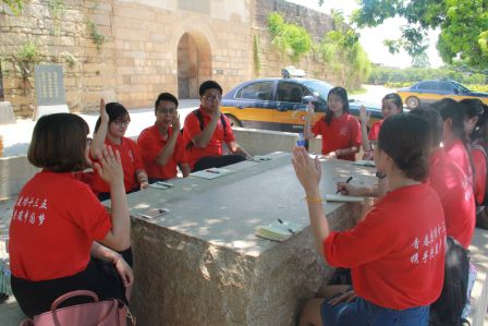 | 厦门大学外文学院“燕遇”暑期社会实践队顺利抵达漳浦县后,在带队老师杨盛澜的指导下,厦门大学外文学院“燕遇”暑期社会实践队成立了临时党支部。 此次实践队队员共计14人,其中4名正式党员,2名预备党员和4名入党积极分子。7月27日上午,实践队前往漳浦县诒安堡调研,队伍中的党员、预备党员和入党积极分子齐聚于堡外的石桌前,召开了调研实践队临时党支部成立会议。会议由 随后,支部书记谭晨进行发言,表示支部将积极发挥带头作用,认真负责,推进实践活动的顺利开展。会议的最后,