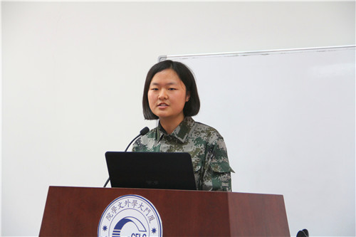 会上,牛姝吉同学也走上讲台与大家分享了她的入伍感言。她说,成为一名人民解放军是她从小到大的梦想,在几个月的准备和考核过程中,她也曾因父母的担忧而动摇过,但最终还是克服了困难,争取到了父母的全力支持,并最终通过了层层选拔。她腼腆地笑说,很高兴能有这个机会和同学们道别,也希望未来回到学校时还可以与同学们再度相见。随后,牛姝吉同学所在15级本科英专2班的班长代表全班同学表达了他们对姝吉同学的祝福并送上祝福卡片,祝愿她接下来在部队的学习与工作一帆风顺。