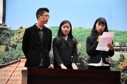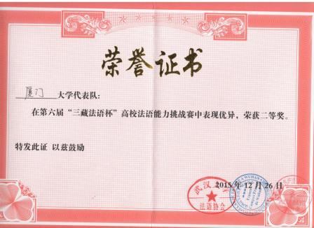 2015年12月26日,第六届“高校法语能力挑战赛”于武汉大学举行。外文学院法语系选派的由郎雅坤(队长)、刘娜、陈嘉琨三人组成厦门大学代表队参赛,他们过五关斩六将,凭借其过硬的法语应用能力,最终获得总分第二名的好成绩,荣获本届大赛二等奖。