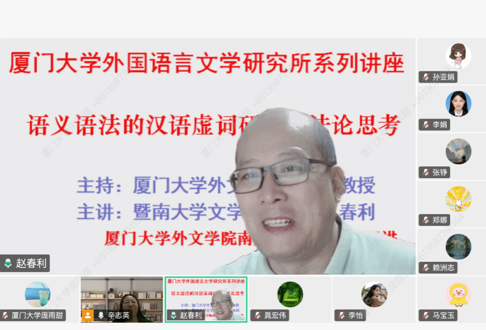 9月27日晚上7点,厦门大学外国语言文学研究所成功邀请暨南大学赵春利教授开展题为“语义语法的汉语虚词研究方法论思考”学术讲座。本次讲座是厦门大学外文学院南光名家讲座第115讲。本次讲座采用腾讯会议平台,于线上举行。讲座由辛志英教授主持,参会人员主要为华体网师生。