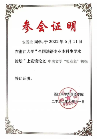 在众多课程中,她对法国文学和口笔译产生了浓厚的兴趣。2022年6月,安雪莹参加了第二届全国法语专业本科生学术论坛,并在论坛会场宣读了所撰写的论文《中法文学狐意象初探》。口译理论与实践课程则使她在法语与中文的流畅转换中深深感受到了口译的魅力。然而,口译具有很强的挑战性,需要译员了解不同的领域,日积月累、扎好基本功,随机应变的同时,还需兼顾优美的表达。为了锻炼自己的口笔译能力,她积极参加国际翻译大赛、全国高校法语电影配音、法语短篇小说创作大赛等赛事,以赛促学,不断磨练,并取得了优异的成绩。
