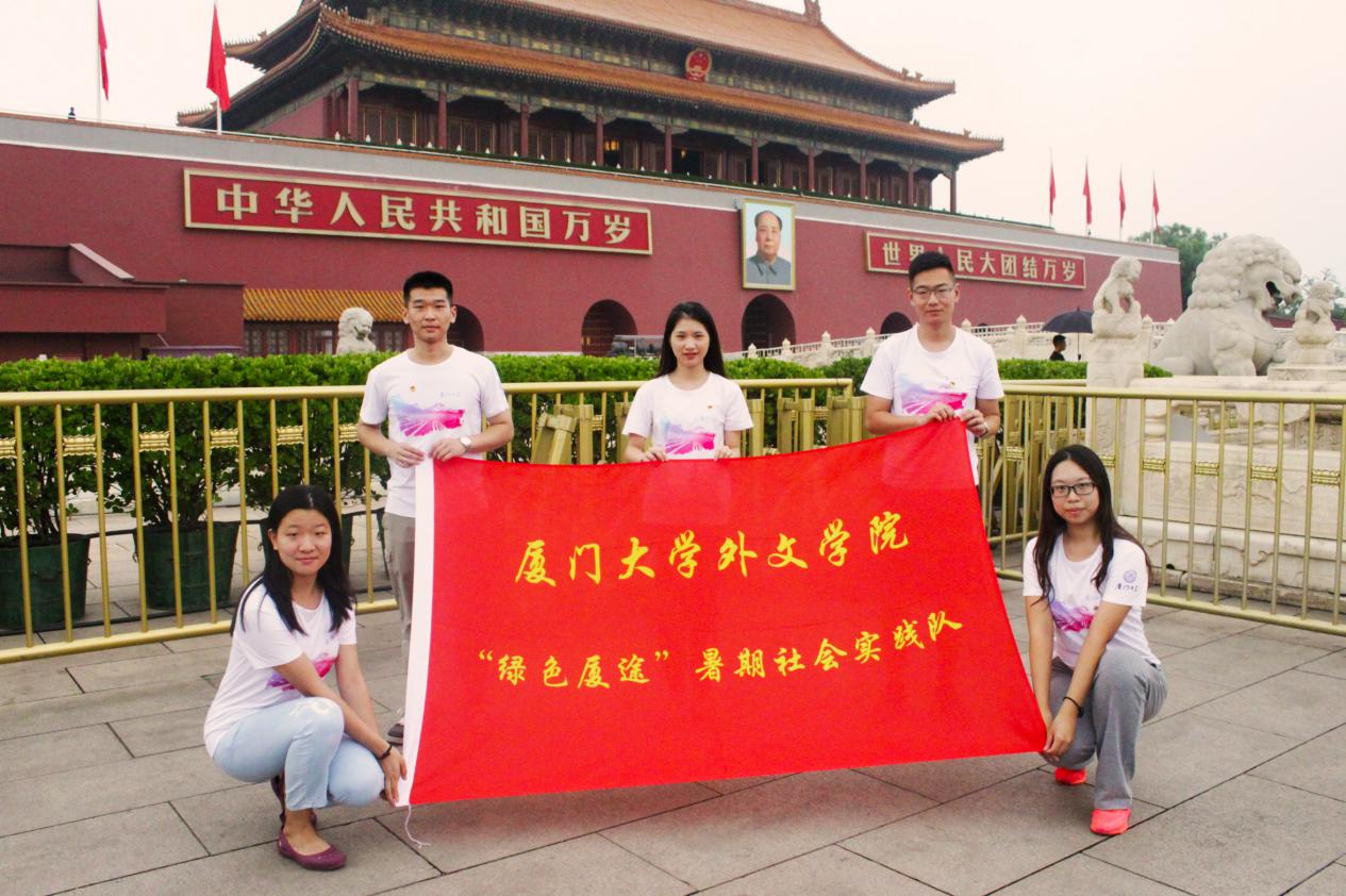 杨文雅(右三)带领外文学院“绿色厦途”实践队前往北京调研