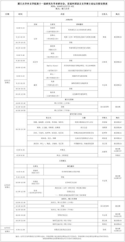 为进一步提高研究生的学术素养和科研水平,助力高校“双一流”建设,厦门大学外文学院第十一届研究生学术研讨会、首届外国语言文学博士论坛(下简称研讨会)将于2018年12月7日至9日在厦门大学举行。