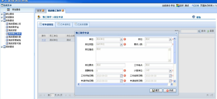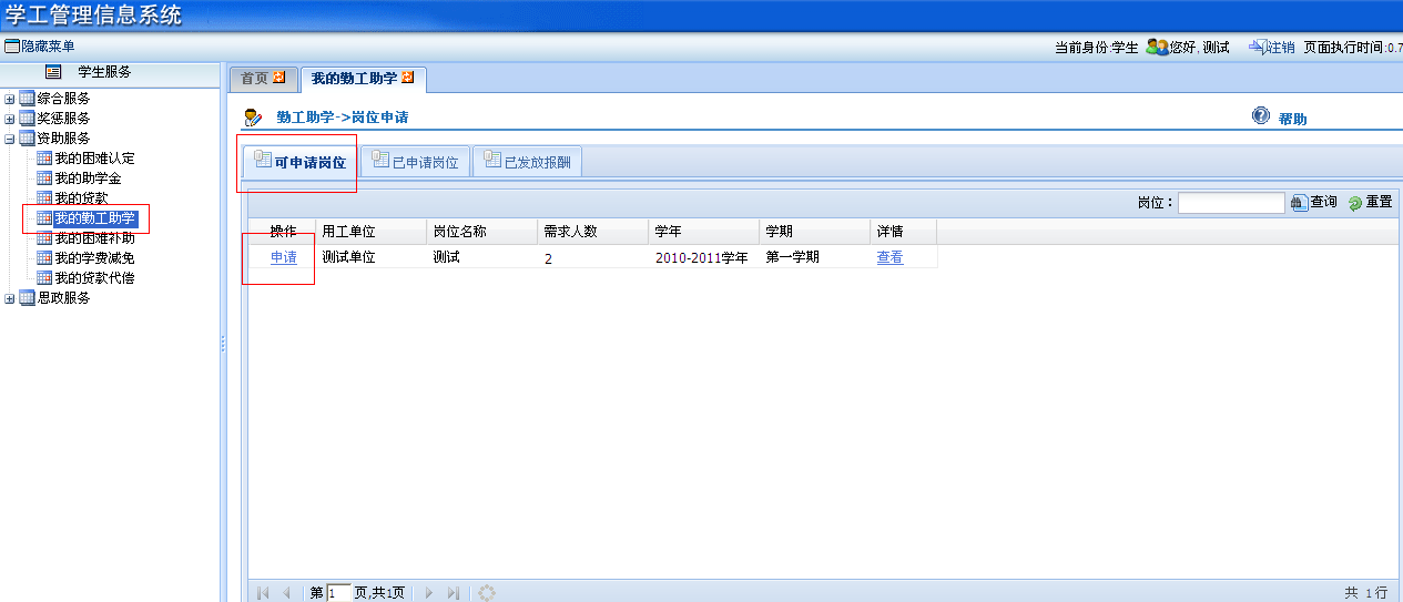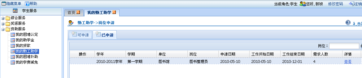 ①登录学工管理信息系统“资助服务”—“我的勤工助学”,查看可申请勤工助学岗位。若有申请意向,则点击该岗位前的“申请”按钮。