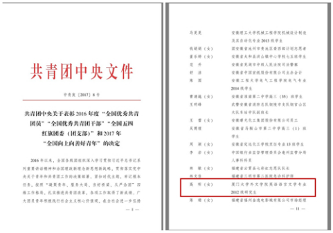 喜讯|外文学院团委在2016年度厦门大学共青团工作先进集体和先进个人评选中喜获表彰