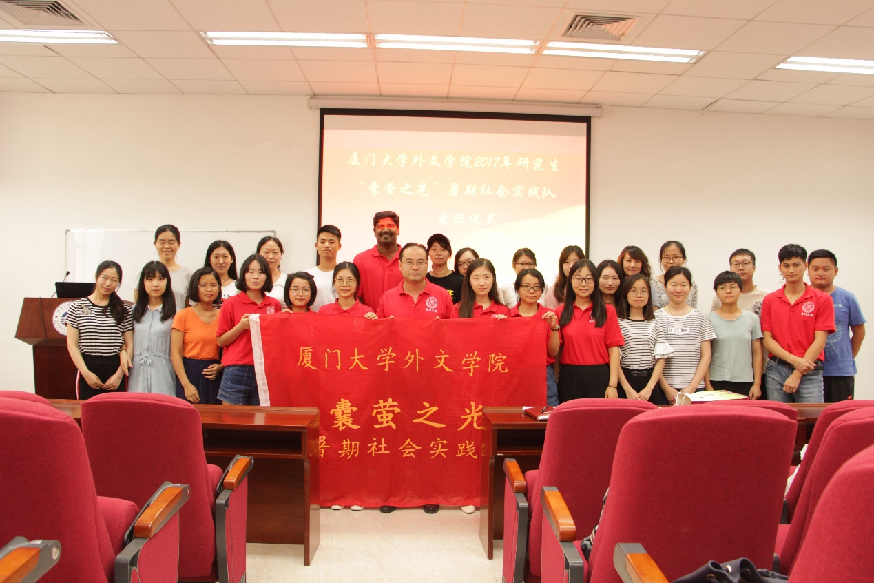 720日下午,厦门大学外文学院研究生“囊萤之光”暑期社会实践队出征仪式在南光三112报告厅成功举行。实践队指导老师、外文学院团委书记、研究生辅导员乐无恙老师和实践队带队老师、院研究生兼职辅导员黄锦鸿以及实践队全体队员悉数参会,本次会议由乐老师主持。
