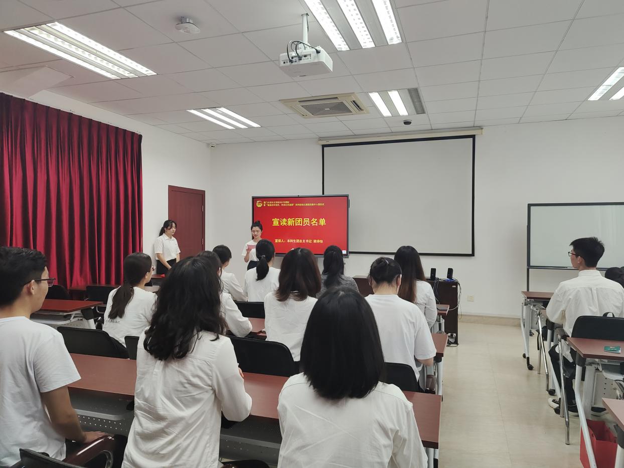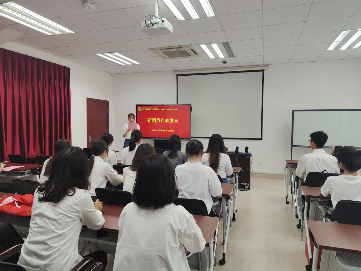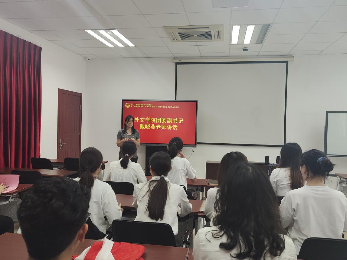 为贯彻落实共青团中央《关于加强新时代团的基层建设着力提升团的组织力的意见》,不断增强团的政治性、先进性、群众性, 更好地发挥党的助手和后备军作用,5月28日中午,外文学院在德贞楼319举行“重温百年党史,传承红色基因”系列活动之新团员入团仪式。团委副书记戴晓燕出席,仪式由本科生团总支副书记陈睿泽主持。
