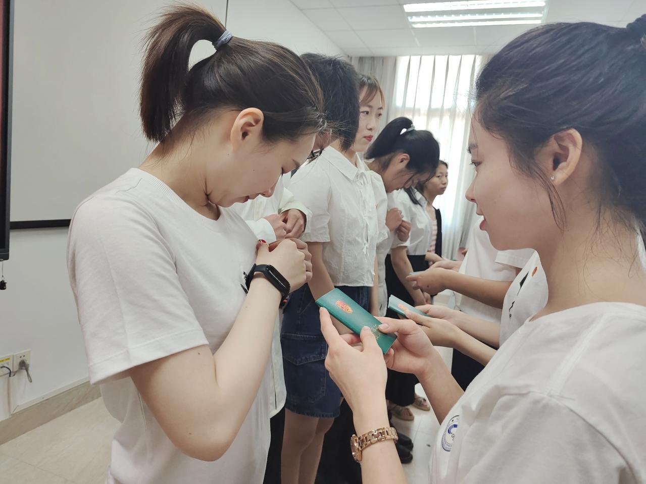 仪式在庄严的国歌声中正式开始。本科生团总支书记梁诗怡宣读新团员名单,随后团员代表向新团员颁发团员证并为其佩戴团徽。