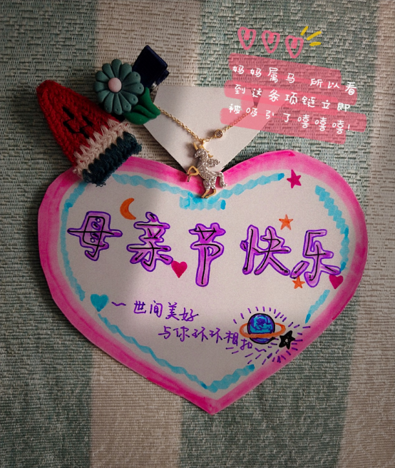 今年母亲节我打算送给妈妈一个手绘的贺卡,上面夹着一个西瓜发卡,挂着一条独角兽项链,背面是想说的话,并且为她做一顿美味的佳肴,再多照顾弟弟,让妈妈好好地休息与享受一下。母亲节快乐!