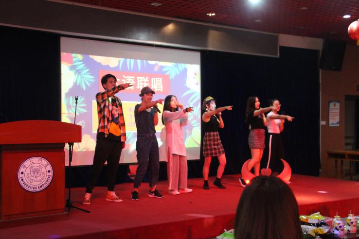 接着,外语教学部的陈柏旭和英语语言文学系的和徐静雅为大家带来歌曲《旋木》和《梦一场》,深情款款,让人沉醉其中。最后一个压轴节目是外文学院特色节目:六语联唱。表演者分别是外语教学部的陈柏旭、英语语言文学系的李嘉杰、外语教学部的吕卓静、日语语言文学系的张佳睿、欧洲语言文学系的陆佳媛和欧洲语言文学系的兰尹彤,他们分别用西班牙语、中文、英语、日语、俄语和德语进行演唱,最后合唱一首《青苹果乐园》,点燃舞台!