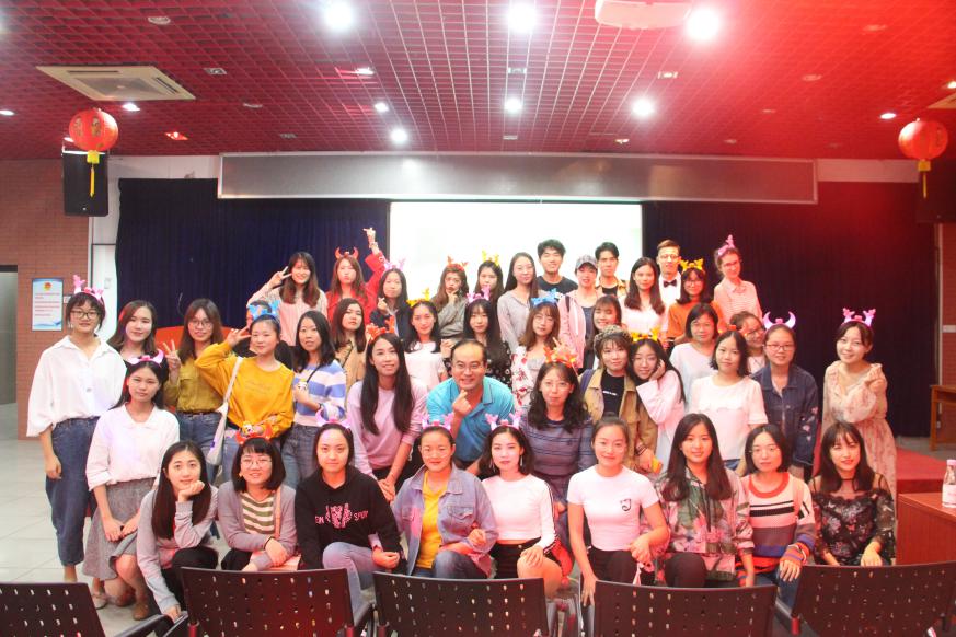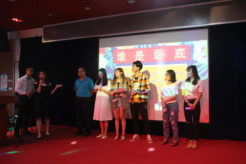 到了第二个互动环节——“击鼓传花”。主持人背过身播放音乐,在座的同学依次传递信物,乐声止而信物在手者,收下信物作为奖品,同时接受挑战,过程中现场欢乐不断。