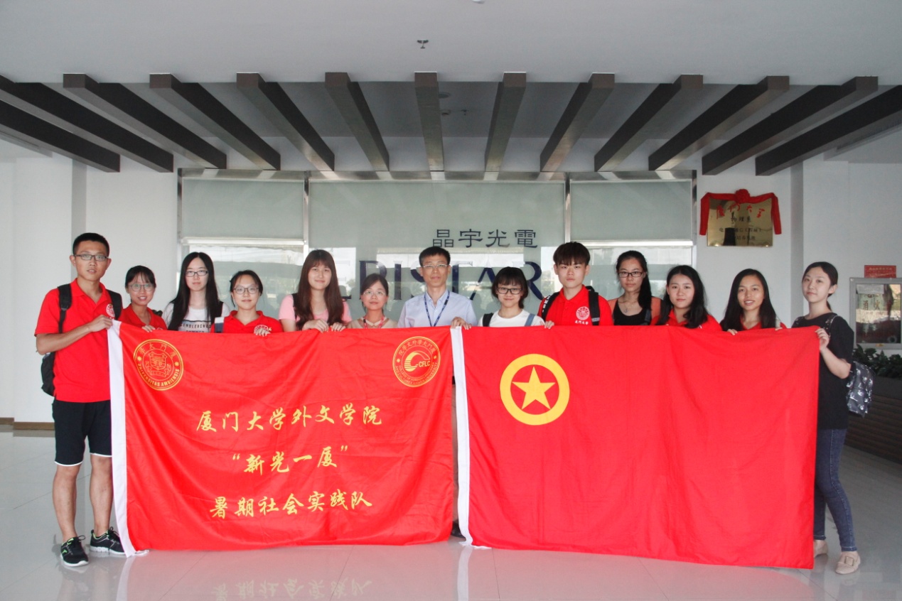 7月23日至7月27日,为了贯彻落实团中央开展“学习习近平总书记讲话、做合格共青团员”教育实践的指示,厦门大学外文学院“新光一厦”暑期社会实践队在指导老师肖盈、蔡宇两位辅导员的带领下前往厦门市翔安区,开展了对该地区光电产业的实地调研。