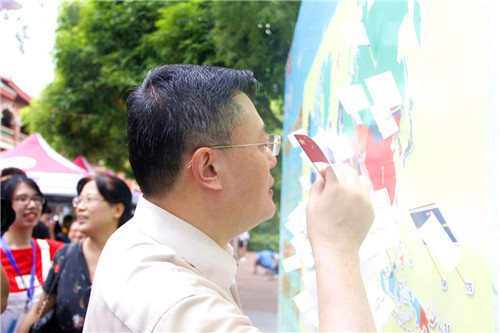 第一天上午10点左右,张荣校长、林东伟副书记来华体网迎新点了解迎新进展,对前来报到的同学们表示慰问,询问了新生的基本情况,并与在场的外文师生亲切交流。在华体网师生的盛情邀请下,张荣校长和林东伟副书记还亲自参与了“中国梦,我的梦”活动,在世界地图上插上了中国国旗。张荣校长表示,“世界眼光”和“家国情怀”对外文学院的学生意义深远重大,希望所有外文师生都能将此次参加厦门金砖会晤的服务奉献精神传承下去,在国际性舞台上发挥越来越重要的作用。