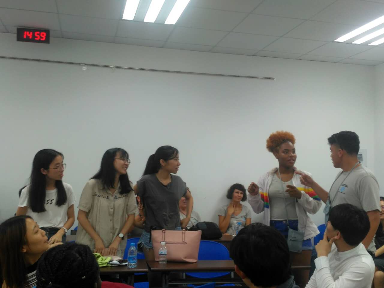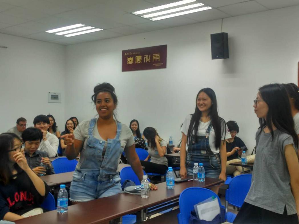 在破冰环节中,美国学生和中国学生四五人为一组,互相介绍各自国家的风土与趣闻,了解彼此的兴趣和爱好,增进了彼此间的了解,现场气氛十分火热,笑声、谈话声充满了整个教室。欢迎会结束后,大家在外文学院院楼前集体合影留念。