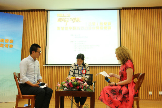 下午14时30分,决赛“对话口译”的比拼更为激烈地展开,这个环节对选手的双向口译能力、交际能力和综合素质进行了考察。选手需要在对话嘉宾话音落下后立即进行翻译。嘉宾们思路开阔,谈话内容以“国际电影节”、“区域性国际组织”等主题,选手们下笔如飞、妙语连珠,引来现场观众的阵阵喝彩。