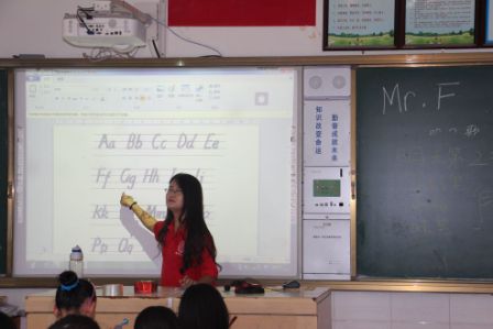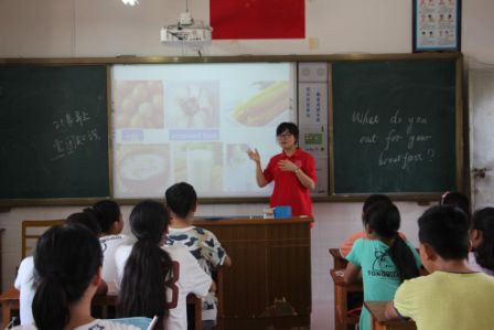 此时,隔壁教室传来朗朗动听的读书声,那正是温艳娟老师在带小朋友们读英语单词。温老师从“What do you eat for breakfast?”入手,教同学们用英语说“豆浆”、“油条”、“馒头”等词,稍后又讲解了“瑜伽”、“仰卧起坐”等与运动相关的单词,图文并茂的教学、单词竞猜游戏更是加快了小朋友们对知识的吸收,在最后的小组比赛环节中小朋友们都抢着站起来回答老师问题,表现优异的同学都赢得了奖品。