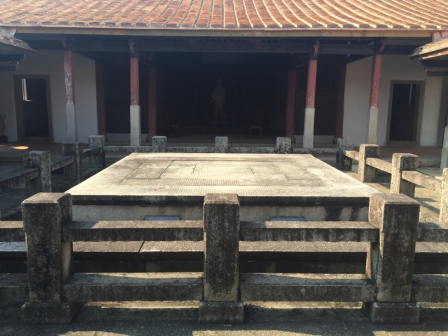 纪念馆建立在黄道周东皋学舍的原址之上,是前后两进的院落。馆中建筑白墙黄瓦,翘梁飞檐,正是当地传统的“燕尾脊”样式。进门第一间大厅上书“明诚堂”三个大字,队员们从相关的介绍中了解到这是黄道周为表明自己为学明理,为人诚忠的心迹而拟的。厅中展示了黄道周生平经历及其重要事迹,队员们仔细参观,不时相互讨论。黄道周学为大儒,武为大将,一反大家对于文人柔弱随和的印象,队员们都对黄道周的忠烈肝胆感叹不已。进了后院,便是黄道周讲学的地方,院中是石砌的讲坛,两面环廊;正厅是讲堂,里面陈列的也多是黄道周的文学和书法作品。队员们站在他的书法前,逐字逐句读着上面的内容,为他深厚的文理和精妙的书法所折服。出到院里,通过与管理纪念馆的蔡阿姨的交谈,队员们了解到院中的讲坛大有名头。原来此坛名为“天方盘”,上有万余方格及大小不等的圆圈,传闻能预测月食等天象。只不过此盘的使用方法由于年代久远而失传,现在成为了一大谜团。