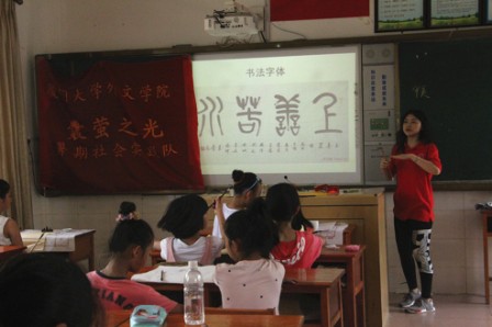 上完足球课之后,同学们恋恋不舍地从操场回到教室。低年级的同学分别从书包里拿出毛笔,墨水,方格纸,原来这节课是支教队员李君茹带来的软笔书法课。李老师从毛笔的握法,坐姿开始给孩子们进行书法的入门指导。孩子们稚嫩的小手握着毛笔按照老师的指导先从最简单的一横一竖开始写起。尽管墨水沾在脸上变成大花猫,手也弄脏了,孩子们还是兴致勃勃地认真练着书法。
