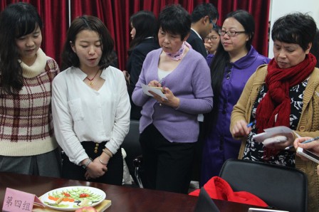 45分钟后,各组选手都已顺利完成了各自的作品。评委老师们共同聆听了各组参赛选手对作品寓意的陈述,并做出了精彩点评。最终,插花比赛的第一组孙静云、秦旭以及第四组的刘晴、陈斯扬和张凯帆等同学以精湛的插花手艺和独到的艺术品位获得一等奖;而由第四组选手邱倩怡、张也、于淑群、许脉然创作的水果拼盘作品则通过展现厦大芙蓉湖畔的碧波美景和活灵活现的黑天鹅被评为一等奖;同时获得水果拼盘大赛一等奖的还有第七组选手。评分结束后,所有参赛选手齐聚一堂,由各评委老师依次为获奖选手颁发获奖证书并合影留念。