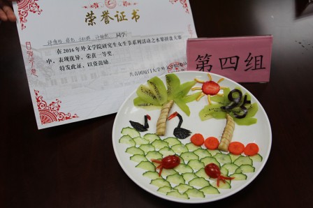 如果说插花将女生们的浪漫情怀体现得淋漓尽致,那么水果拼盘组女生们的巧手匠心也在比赛中得到了充分施展。比赛前还只是一个个不起眼的普通水果,在一双双巧手的精雕细琢下,如同被施了魔法一般,蓦地变成恭贺母校95寿诞的生日蛋糕、霸气十足的“九五至尊”,还有那清风习习的芙蓉湖景以及优雅游弋的天鹅。形态之丰富,想象之新奇,令人称奇。“花”“果”各具特色,但表达的既是对外文学院女研究生们的无限祝福,亦是对母校的崇敬之情!