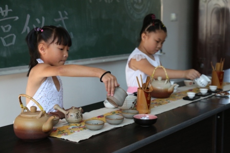 领导、老师发言过后,实践队队长马璇带领全体队员宣誓,表示愿尽己所能、竭尽全力,践行志愿精神,为安溪教育贡献自己的力量。宣誓过程肃穆严谨,宣誓内容慷慨激昂。之后,两位安溪县本地小朋友为大家带来了精彩的公益茶艺表演,她们优雅大方,流畅自然的表演赢得了观众们的阵阵掌声,老师同学也借此机会感悟了安溪的茶文化。